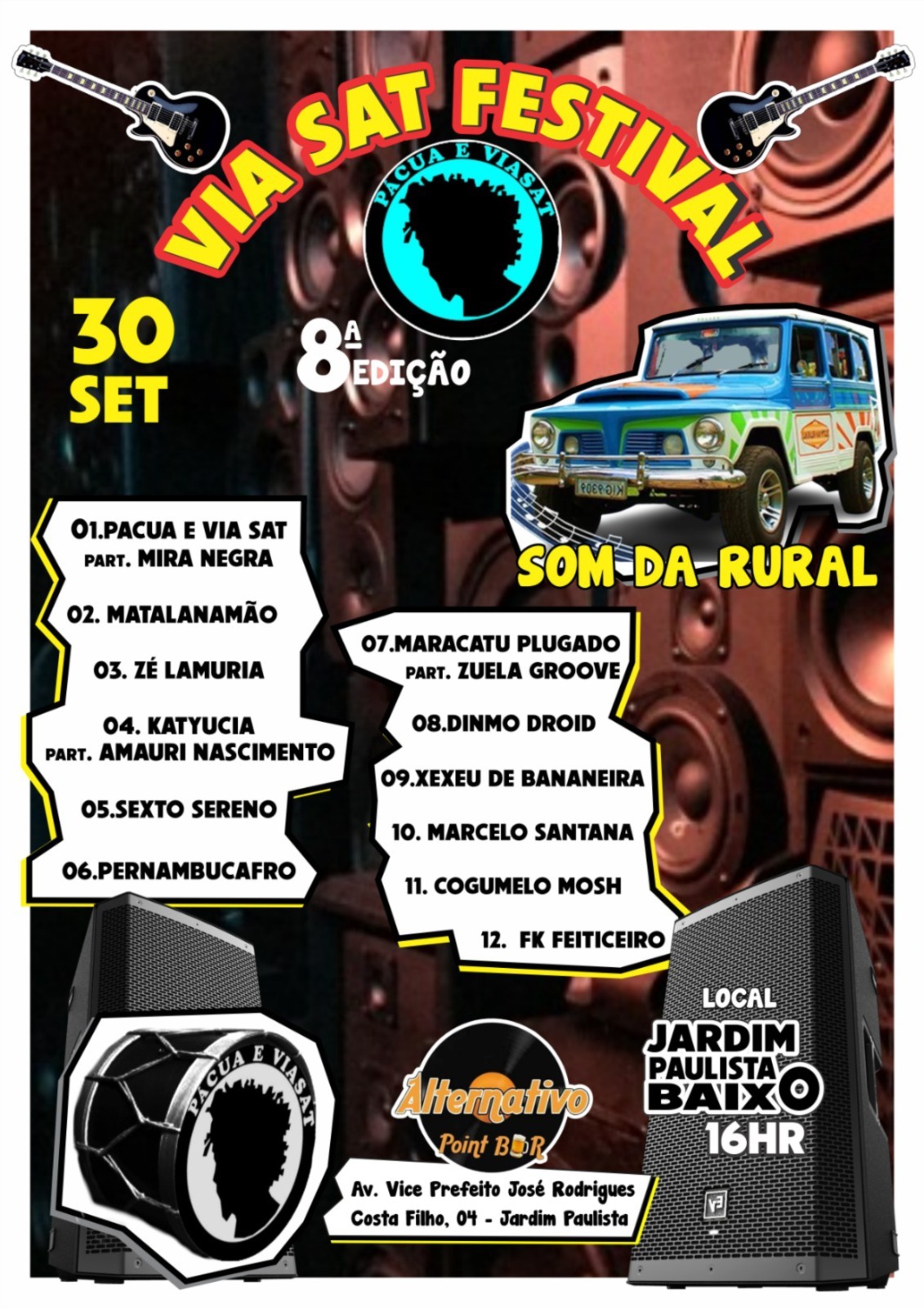 A Cidade do Paulista, recebe neste sábado (30), a 8ª Edição do Via Sat Festival, u festival de música que promove um verdadeiro regaste a cultura local. O evento gratuito acontece em frente Alternativo Point Bar que fica localizado na Avenida Vice Prefeito José Rodrigues Costa Filho, Jardim Paulista, Paulista.