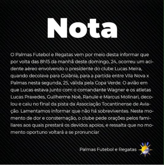 A queda de um pequeno avião, logo após a decolagem, na manhã deste domingo (24), causou a morte de quatro jogadores e do presidente do Palmas-TO, além do piloto. A aeronave foi tomada pelas chamas, após a queda em um pista de pouso particular no distrito de Luzimangues (TO), a cerca de oito quilômetros da capital Palmas. Morreram o presidente do clube, Lucas Meira, de 32 anos;  os jogadores Lucas Praxedes (23 anos), Guilherme Noé (28), Ranule (27), e Marcus Molinari (23), além do piloto da aeronave, identificado apenas como Wagner.