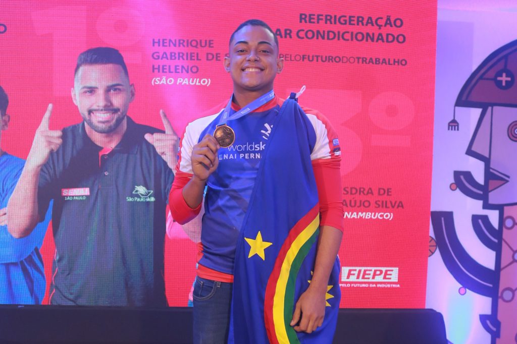 Wesdra Silva exibe a medalha de bronze, conquistada na ocupação Refrigeração e Ar-Condicionado (#38)