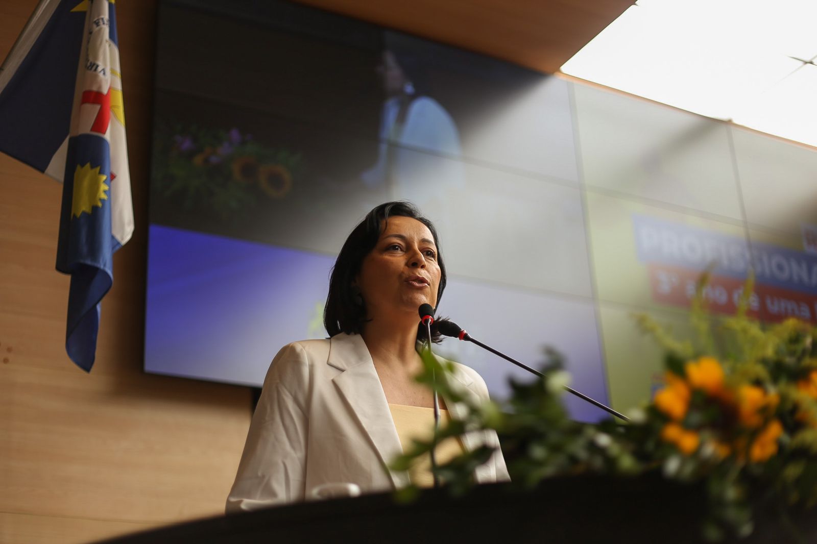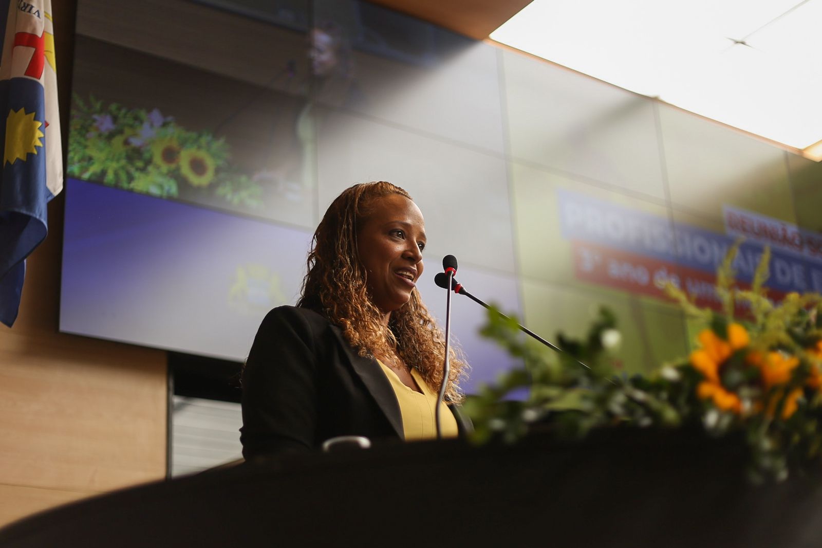 A profissional de Educação Física Tatiana Acioli, representando os profissionais presentes , falou na tribuna em nome de toda a categoria. “Quero agradecer a todos da mesa, e principalmente aos meus professores que me tornaram a profissional que sou hoje. A todos vocês, o meu muito obrigado. Espero que outros também tenham orgulho dessa profissão. Meu agradecimento aos colegas profissionais de Educação Física por toda contribuição social e dedicação. Tenho um extremo orgulho de minha profissão e agradeço a essa casa, pelo reconhecimento e ao nosso Conselho, o CREF, pelo importante trabalho e por cuidar de nossa profissão, fazendo com que ela esteja no patamar que merece”, disse Tatiana, pedindo ao final, uma salva de palmas para a Educação Física.
