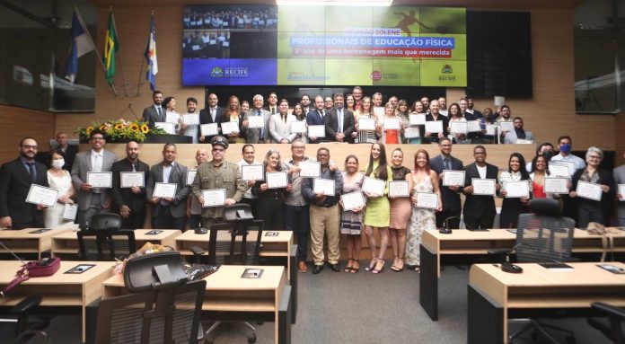 Bastante prestigiada na manhã desta quinta-feira (08), a Câmara Municipal do Recife realizou uma sessão solene indicada pelo Conselho Regional de Educação Física de Pernambuco (CREF12/PE) e requerida pelo vereador Rinaldo Júnior (PSB), onde prestou homenagem aos Profissionais de Educação Física da cidade. A solenidade aconteceu no plenário da Casa Legislativa e 68 profissionais do Recife foram homenageados durante a sessão.