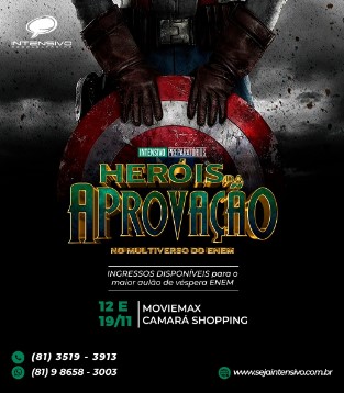 O Intensivo Preparatórios promove, nos sábados 12 e 19 de novembro, dois aulões para o Enem que são, literalmente, coisa de cinema. Com o tema “Heróis da Aprovação”, os encontros irão ocorrer no Moviemax Camará Shopping e têm como objetivo ajudar os vestibulandos a revisarem os assuntos mais recorrentes no Exame Nacional do Ensino Médio, porta de entrada para as principais instituições de ensino superior do País.