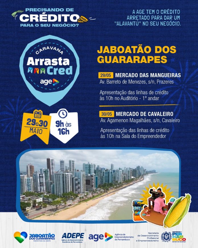 O município do Jaboatão dos Guararapes recebe, nos próximos dias 29 e 30 de maio, a Caravana Arrasta Cred AGE, que visa disponibilizar crédito para empreendedores e micro e pequenos empresários que têm como foco a comercialização de bens, produtos e serviços durante o período junino.