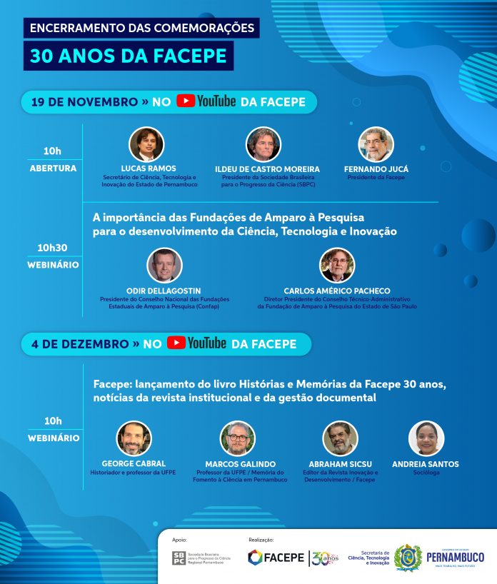 Já no dia 4 de dezembro (sexta-feira), também a partir das 10h, haverá um segundo webinário que será marcado pelo pré-lançamento do livro Histórias e Memórias da Facepe 30 anos, de autoria do historiador e professor da Universidade Federal de Pernambuco (UFPE), George Cabral, e da socióloga Andreia Santos. Haverá ainda a apresentação do projeto de Gestão Documental da Facepe, coordenado pelo também docente da UFPE Marcos Galindo. Ele vai falar do tema intitulado Memória do Fomento à Ciência em Pernambuco. Além disso, o evento contará com a participação do editor chefe da Revista Inovação e Desenvolvimento, publicação institucional da Facepe, Abraham Sicsú, que foi presidente da Fundação até ano passado.