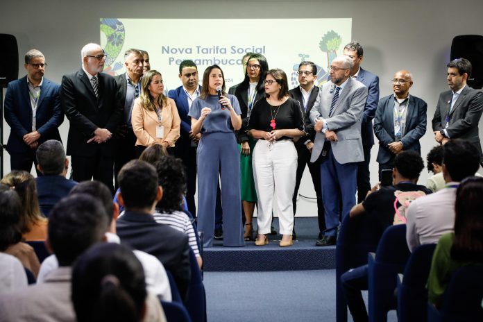 O Governo de Pernambuco lançou, nesta terça-feira (03), a criação de uma nova tarifa social da Compesa para beneficiar mais pernambucanos de baixa renda. O evento realizado na sede da companhia, no bairro de Santo Amaro, no Recife, contou com a participação da governadora Raquel Lyra e sua vice Priscila Krause. A iniciativa vai alcançar 1,63 milhão de pessoas com uma cobrança mais acessível pela prestação dos serviços de água e esgoto no estado, permitindo uma inclusão do acesso aos sistemas essenciais. A proposta, chamada Tarifa Social Pernambucana, visa fixar o valor de R$ 27,47 por mês na conta de água e R$ 54,94 nas áreas onde há a prestação dos serviços de esgotamento sanitário, gerando um desconto de 55% na conta.