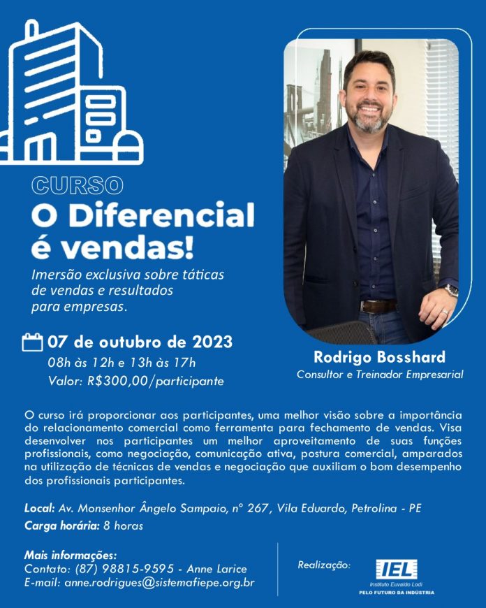A imersão exclusiva sobre táticas de vendas e resultados para empresas terá uma carga horária de 8 horas e será ministrada pelo consultor e treinador empresarial Rodrigo Bosshard. Segundo a coordenadora da Unidade Regional do Sertão do São Francisco da Federação das Indústrias do Estado de Pernambuco (URSF/FIEPE), Fabiana Ribeiro, a proposta é desenvolver nos participantes um melhor aproveitamento de suas funções profissionais.