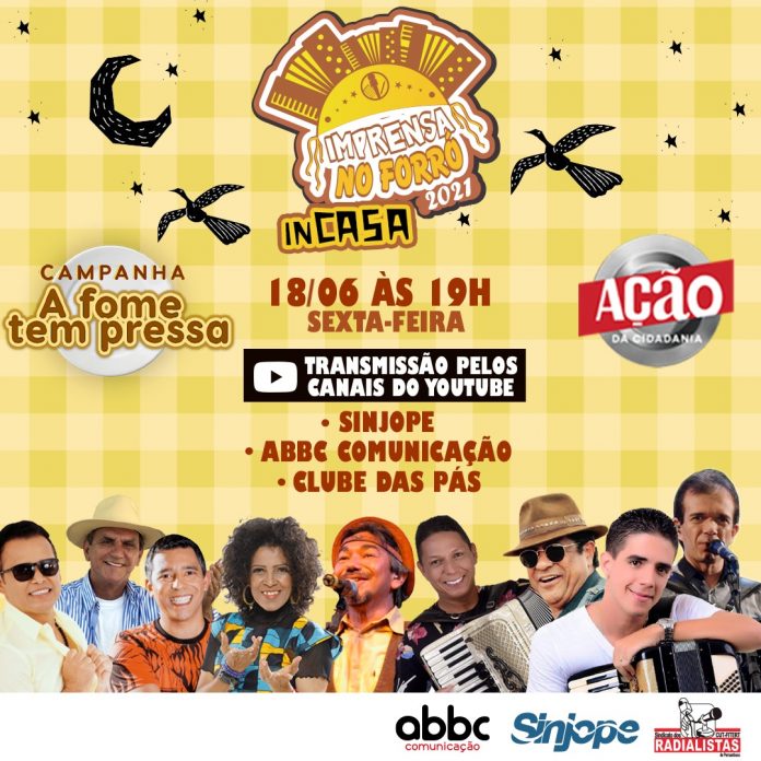 A 18ª Edição do Imprensa no Forró será mais uma vez através de uma LIVE SOLIDÁRIA, para reforçar a campanha A FOME TEM PRESSA, com atrações de peso, como Almir Rouche, Jorge Neto, Santanna “O cantador”, Maciel Melo, Petrúcio Amorim, Rodrigo Raposo, Waldonys (CE), Targino Gondim (BA), Nádia Maia e a tradicional Orquestra das Pás, dia 18 de Junho, às 19:00 no Canal do YouTube, e com sorteio de brindes
