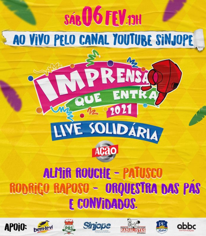 No dia 06 de fevereiro de 2021, acontece de uma forma diferente, o tradicional baile IMPRENSA QUE ENTRA, prévia carnavalesca Solidária que reúne profissionais de comunicação de todo o estado e do país. A prévia carnavalesca acontece em parceria com o Sindicato dos Jornalistas de Pernambuco, Sindicato dos Radialistas e Comitê Estadual da Ação e Cidadania – Pernambuco Solidário, com arrecadação de alimentos para as famílias carentes de todo estado. Por esse motivo nobre, o baile vai acontecer de forma virtual, no formato de LIVE, e respeitando todas as normas sanitárias, todos os protocolos de distanciamento, para que possa receber as doações nesse momento tão delicado, em que muitas famílias precisam de ajuda.