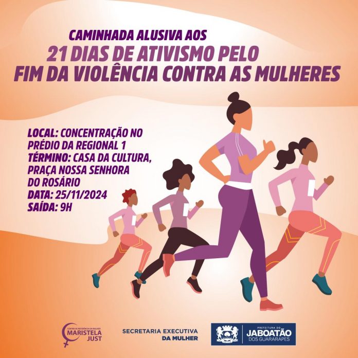 A Prefeitura do Jaboatão dos Guararapes promoverá, nesta segunda-feira (25), uma caminhada alusiva aos “21 dias de ativismo pelo fim da violência contra as mulheres”. A concentração será no prédio da Regional 1, na avenida Barão de Lucena, s/n, em Jaboatão Centro, com saída às 9h. O percurso seguirá até a Casa da Cultura, na Praça Nossa Senhora do Rosário.