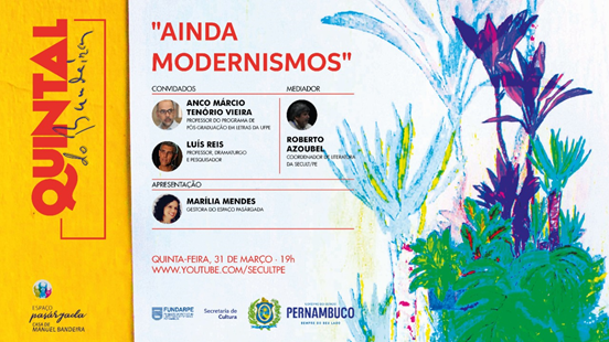 O Espaço Pasárgada, equipamento cultural gerenciado pela Fundarpe, retoma as atividades do Quintal do Bandeira. Com o tema “Ainda modernismos”, o encontro ocorre na próxima quinta, 31, às 19h, com transmissão livre e gratuita por meio do canal youtube.com/SecultPE. A apresentação será de Marília Mendes, gestora do Pasárgada, com mediação de Roberto Azoubel, coordenador de Literatura da Secretaria de Cultura do Estado.