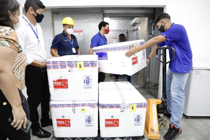 Pernambuco recebeu, na noite desta quarta-feira (24.02), mais 48 mil unidades da vacina Sinovac/Butantan, o que possibilitará avançar na proteção dos trabalhadores de saúde em ambas as doses, beneficiando todo o território pernambucano. Com os imunizantes que chegaram ao Aeroporto Internacional dos Guararapes às 20h, Pernambuco finalizou o dia com mais 130 mil doses de vacinas contra a Covid-19. Pela manhã, já haviam chegado 82 mil unidades da farmacêutica AstraZeneca/Universidade de Oxford, desenvolvidas em parceria com a Fundação Oswaldo Cruz (Fiocruz) e produzidas pelo Instituto Serum, na Índia, que garantirão a primeira dose para idosos entre 80 e 84 anos de idade, em todos os municípios do Estado.