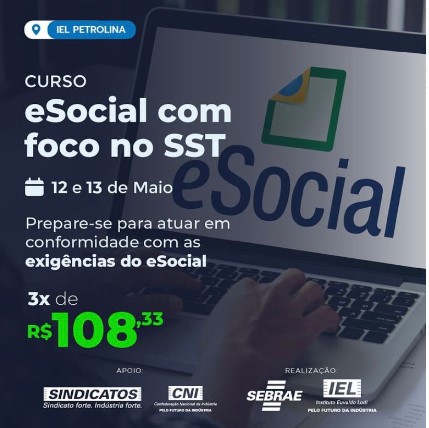 Uma oportunidade inédita em Petrolina para preparação de gestores e colaboradores, visando a adequação das empresas às exigências do eSocial com foco no SST (Saúde e Segurança do Trabalho). O Instituto Euvaldo Lodi (IEL- PE) já abriu as inscrições e vai realizar, nos dias 12 (18h às 22h) e 13 de maio (8h às 17h), o curso ‘eSocial com foco no SST’.