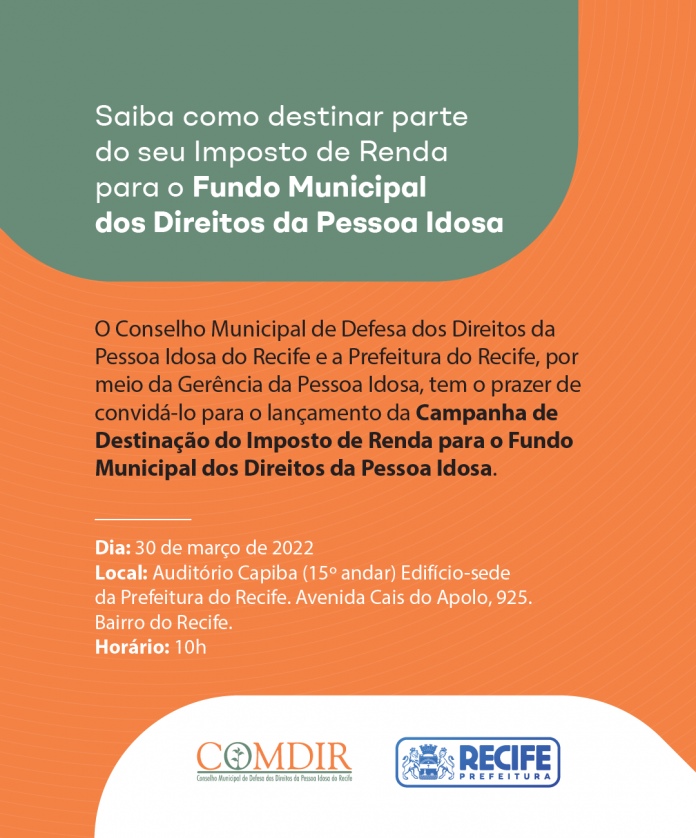 A Secretaria de Desenvolvimento Social, Direitos Humanos, Juventude e Políticas sobre Drogas, por meio da Gerência da Pessoa Idosa e do Conselho Municipal de Defesa dos Direitos da Pessoa Idosa do Recife (Comdir), lança amanhã (30), uma campanha para incentivar pessoas físicas e jurídicas a destinarem para o Fundo Municipal da Pessoa Idosa, parte do seu Imposto de Renda devido na declaração. O lançamento será realizado, às 10h, no auditório Capiba, localizado no 15º andar do edifício-sede da Prefeitura, no Cais do Apolo, bairro do Recife, com explanações do Conselho Regional de Contabilidade sobre o tema.