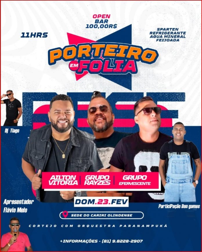 O evento da agremiação Porteiro em Folia acontece na Sede do Cariri Olidense, que fica localizado na Rua Cândida Luísa – Guadalupe – Olinda e promete agitar os foliões que poderão desfrutar de uma experiência única e marcante que tomará as principais ruas de Olinda, com seu desfile e uma roupa nova confeccionada pelo Beto Costureiro, que sempre teve o desejo costurar as roupas do Porteiro em Folia, deixando sua marca e característica.
