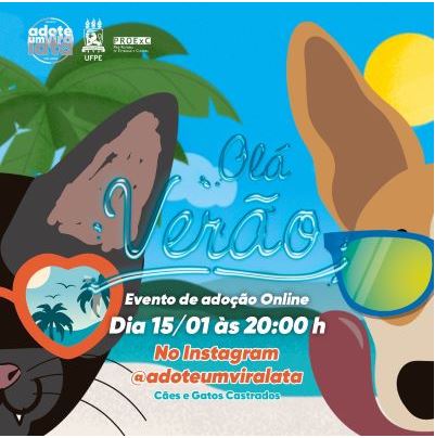 O programa de extensão Adote um Vira-Lata, da Universidade Federal de Pernambuco (UFPE), promove nesta sexta-feira (15), às 20h, o seu 10° Evento de Adoção Virtual. Na live, que será realizada no perfil do projeto no Instagram (@adoteumviralata), serão divulgadas imagens de cães e gatos saudáveis e castrados que estão disponíveis para adoção. Após a live, os protetores responsáveis por cada animal estarão à disposição para conversar a respeito da adoção.
