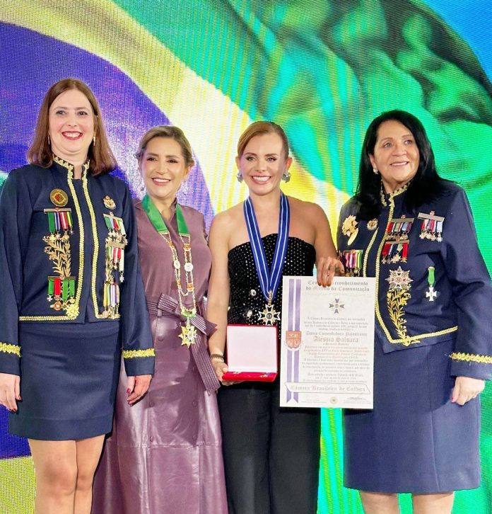 Publicitária com mais de 600 marcas posicionadas no mundo, Aléssia Saluára, recebeu, na noite da quinta-feira (23), a ‘Cruz do Mérito da Comunicação’. Concedida pela Câmara Brasileira de Cultura e Academia de Ciências e Artes, a honraria foi entregue durante jantar solene do Encontro Nacional de Notáveis Acadêmicos, no auditório 5 da Plataforma Internacional Pablo Marçal, em Alphaville, São Paulo.