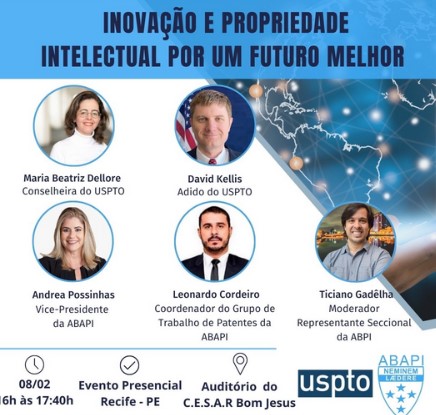 Com mediação do advogado Ticiano Gadêlha, representante da Associação Brasileira de Propriedade Intelectual no Nordeste, o tema será debatido por Maria Beatriz Dellore e David Kellis, ambos do USPTO – Escritório norte-americano de Marcas e Patentes. Andrea Possinhas (Vice-Presidente) e Leonardo Cordeiro (Coordenador do Grupo de Trabalho de Patentes), serão os palestrantes que representarão a ABAPI no evento.