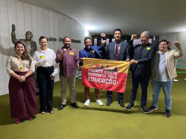 “Hoje, mais uma vez o SINPROP compondo a executiva nacional da Frente Norte e Nordeste pela Educação esteve na reabertura dos trabalhos legislativos da Câmara Federal, onde visitamos todos os líderes partidários, dialogando, argumentando e entregando ofícios, solicitando formalmente a manutenção do texto aprovado no Senado Federal, que foi um texto construído junto com a Frente Norte e Nordeste em articulação com a senadora Professora Dorinha e o senador Omar Azis, que garantiu o FUNDEB fora do arcabouço fiscal, o que é fundamental, pois 90% da educação básica é financiada pelo FUNDEB. Portanto, colocá-lo no arcabouço significa extremo retrocesso e contingenciamento para a educação, e nós não iremos aceitar isso. Na visita aos líderes todos, sem exceção, disseram que concordavam com o que foi aprovado no Senado Federal”, ressaltou Gilberto Sabino, presidente do SINPROP e integrante da executiva nacional da Frente Norte e Nordeste pela Educação.