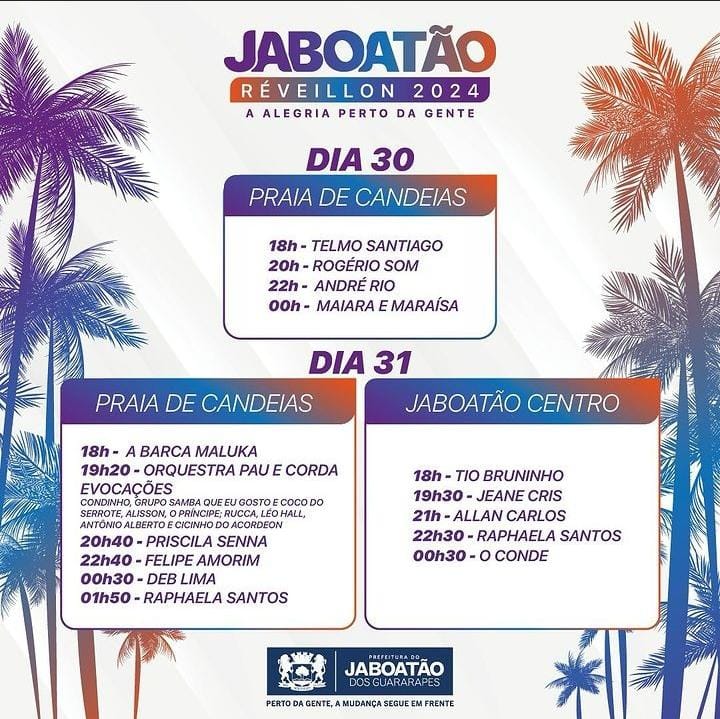 É hoje! O primeiro Réveillon em dose dupla promovido pela Prefeitura do Jaboatão dos Guararapes começa neste sábado, em Candeias. E promete muitas emoções! Telmo Santiago abrirá as festividades às 18h, seguido por Rogério Som, às 20h. André Rio assume a festa às 22h e passa o comando da alegria para a atração mais esperada: Maiara e Maraísa, que sobem ao palco à meia-noite. O polo fica próximo ao Sesc e terá dois telões distribuídos na areia, além de espaços para pessoas com deficiência de locomoção, intérpretes em libras, brinquedos e mais de mil pessoas envolvidas em serviços de segurança, saúde, conselho tutelar, iluminação, fiscalização e apoio.