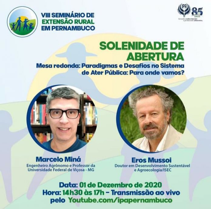 Começa nesta terça (01/12), o VIII Seminário de Extensão Rural em Pernambuco, realizado pelo Instituto Agronômico (IPA), órgão vinculado à Secretaria de Desenvolvimento Agrário. Com o tema Ater Pública – Novos tempos, novos desafios, o evento antecede o Dia Nacional do Extensionista Rural, comemorado no próximo domingo, 6 de dezembro. A programação começa a partir das 14h30, de forma online, com transmissão ao vivo pelo Canal do IPA no Youtube (ipa.pernambuco).
