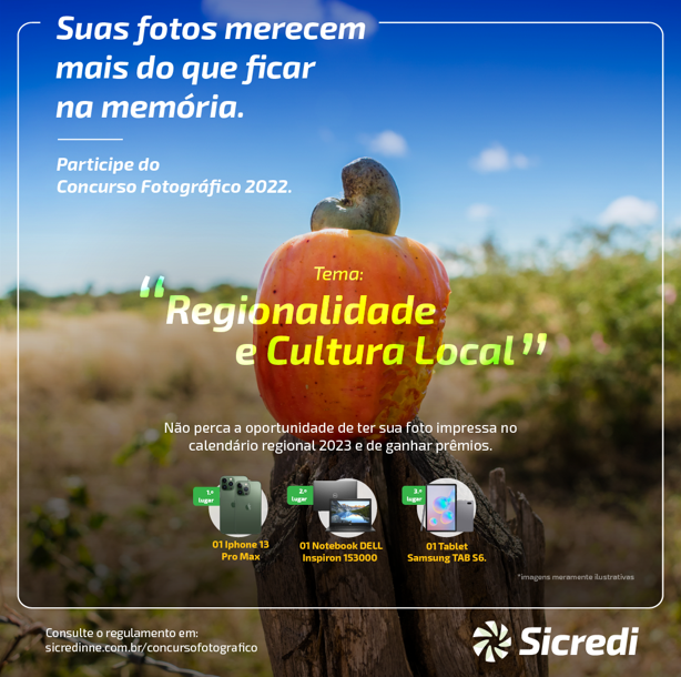 Buscando inovar e trazer mais representatividade à cultura nordestina, a Sicredi Recife, em parceria com a Central Sicredi Norte-Nordeste , promove entre os seus associados o Concurso Fotográfico 2022 de tema “Regionalidade e Cultura Local”. A premiação contemplará as melhores fotografias que representarem a cultura nordestina nas temáticas: Dança, Artesanato, Culinária, Expressões Artísticas, Monumentos Históricos e Eventos Locais.