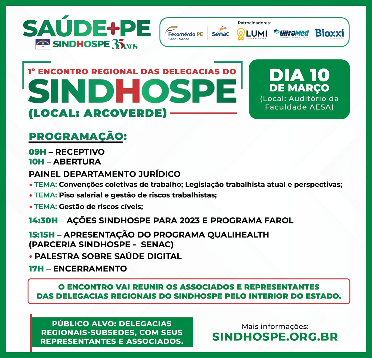 O Sindicato dos Hospitais, Clínicas, Casas de Saúde, Laboratórios de Pesquisas e Análises Clínicas de Pernambuco (Sindhospe) promove no dia 10 de março, o 1º Encontro Regional das Delegacias. O evento será realizado no município de Arcoverde, Mesorregião do Sertão Pernambucano, no auditório da Faculdade AESA.