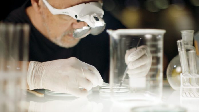 Segundo Izuno, o processo de escrita na pele exigiu muita pesquisa devido à necessidade de técnicas extremamente delicadas. “Utilizamos uma impressão UV de alta precisão, transferindo os microtextos para uma película e, posteriormente, para a pele cultivada. Isso foi fundamental para manter a nitidez sem perder a textura original. Por ser uma pele biológica de apenas 4 mm, cultivada em laboratório para simular a menopausa, o processo foi complexo. Testamos várias alternativas até chegarmos ao decalque. A aplicação exigiu um ambiente controlado e equipamentos adequados até alcançarmos o resultado: a pele escrita!”, afirma o artista.