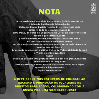 A Universidade Federal de Pernambuco (UFPE), através do Núcleo de Políticas da Educação das Relações Étnico-Raciais (Núcleo Erer), manifesta toda solidariedade ao estudante Lucas de Lima Paiva, do curso de Engenharia da UFPE, em decorrência do racismo que sofreu durante passeio em uma marina, em Paulista. O racismo que é estruturado na sociedade coloca em risco os jovens negros, que têm quatro vezes mais chance de morrer que um jovem branco, de acordo com o último Índice de Vulnerabilidade Juvenil à Violência e Desigualdade Racial.