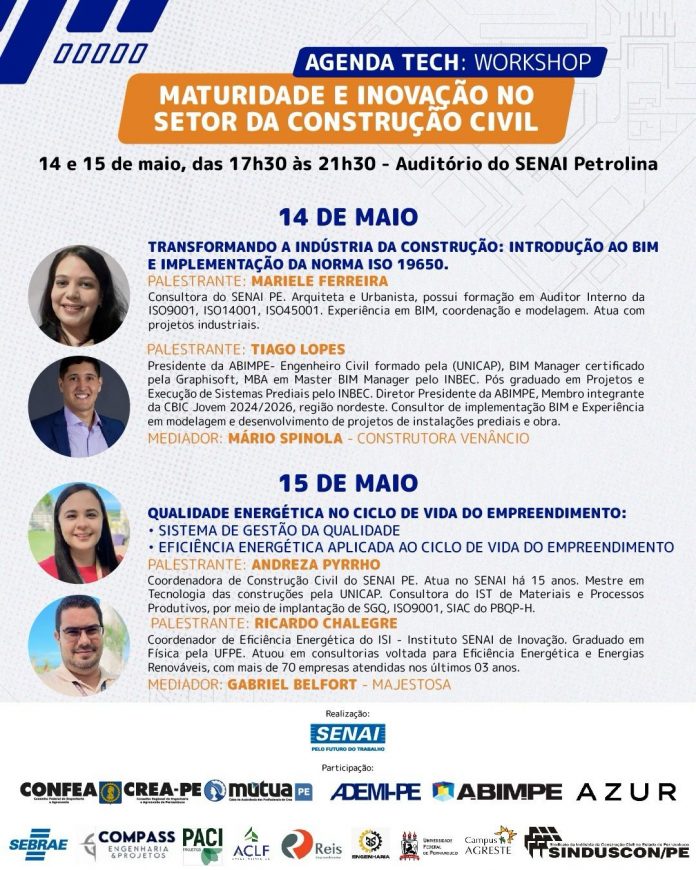 Segundo a gestora escolar regional da entidade, Carol Campos, o primeiro painel do workshop será realizado no dia 14, com o tema “Transformando a indústria da construção: introdução ao BIM e implementação da norma ISO 19650”. O conteúdo será apresentado pela arquiteta e consultora do SENAI Mariele Ferreira, junto com o engenheiro civil e presidente da Associação para o Desenvolvimento e Promoção do BIM no Estado de Pernambuco (ABIMPE), Tiago Lopes.